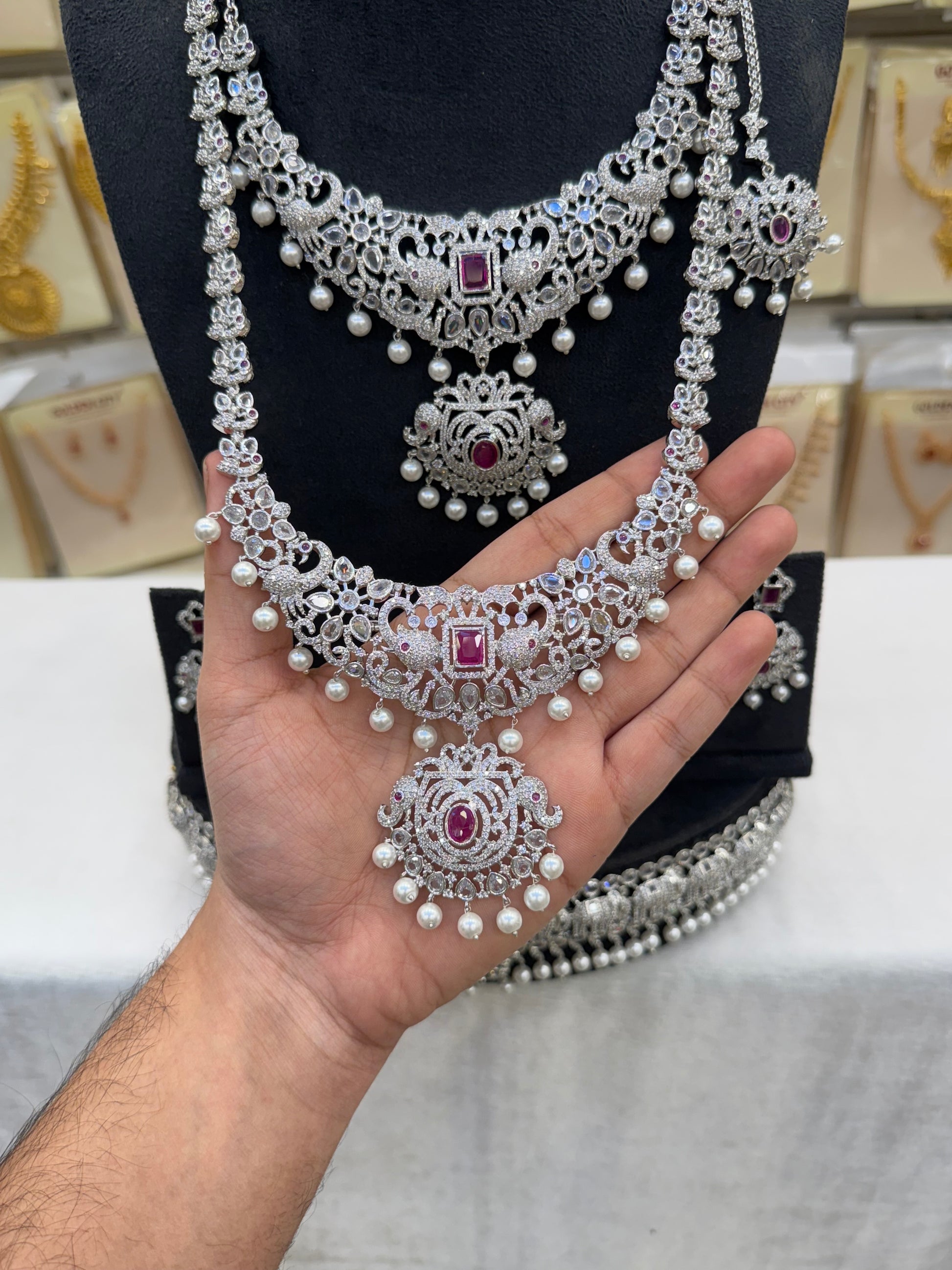 Beautifully embellished with radiant A.D. stones, this set includes a matching hipbelt — offering a complete and graceful look for brides who love timeless tradition with a touch of sparkle.