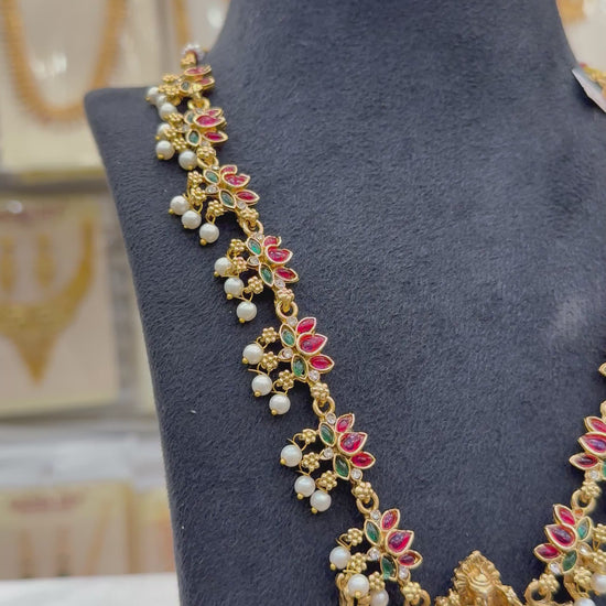 Combining divine Lakshmi motifs with multicolored stones, this antique chain reflects spiritual richness and vibrant elegance — perfect for adding a traditional touch to bridal and festive attire.