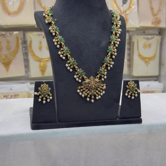 Inspired by the elegance of the lotus flower, this antique necklace features intricate detailing and timeless craftsmanship — a perfect blend of spiritual beauty and traditional charm for bridal and festive wear.