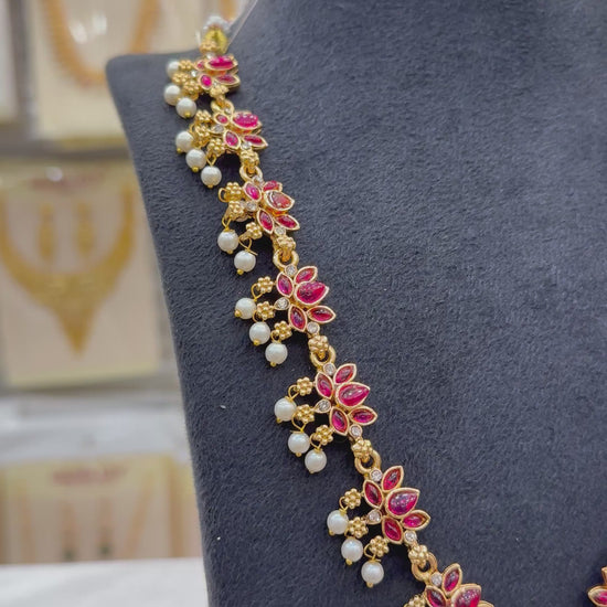 Gracefully designed with a lotus motif and radiant red stones, this antique necklace blends spiritual symbolism with timeless beauty — perfect for bridal and traditional wear.
