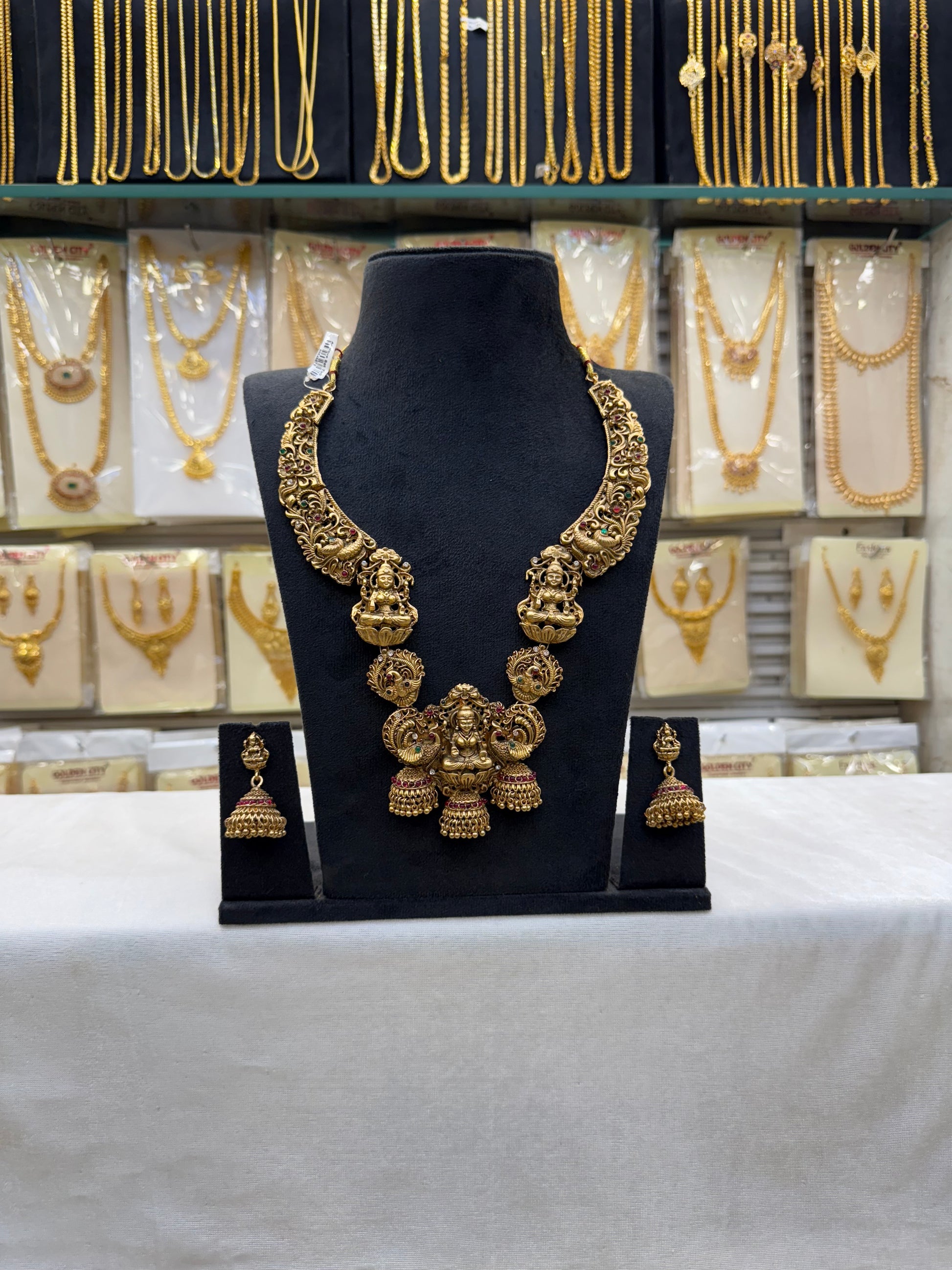 Featuring detailed Nagas artistry and rich antique finish, this haram captures the essence of South Indian heritage — a bold and divine choice for bridal and temple wear.