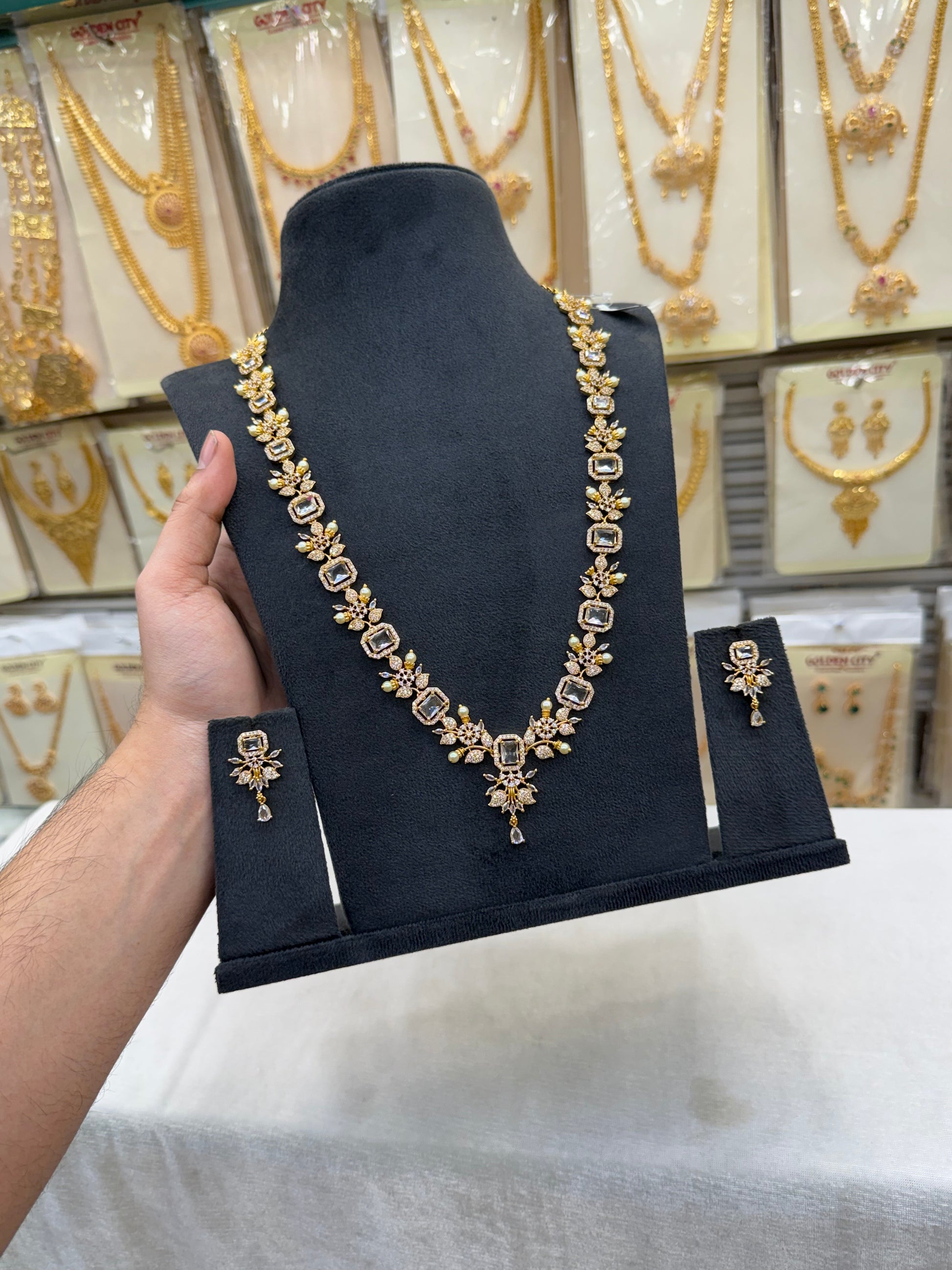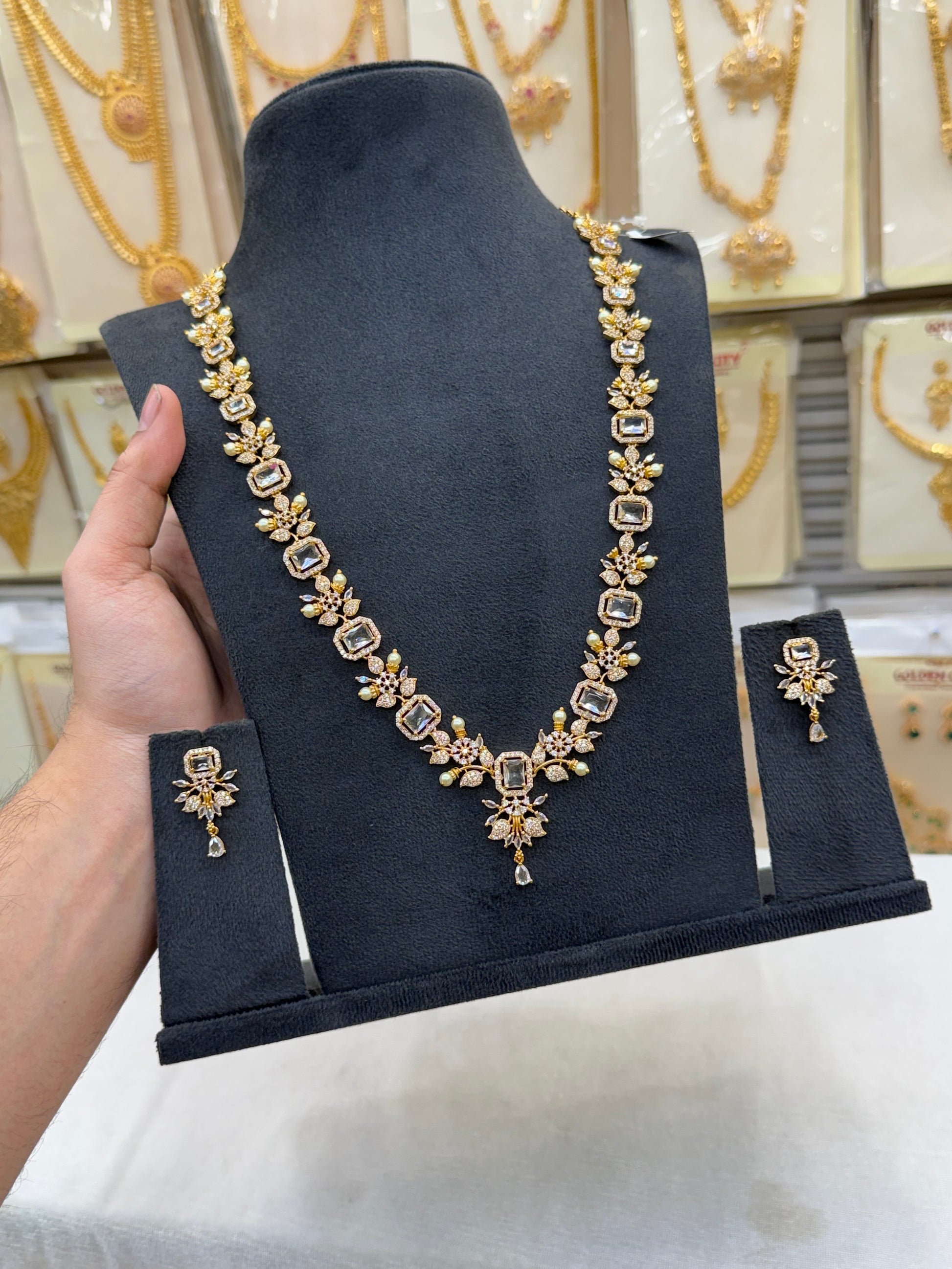 Explore our premium A.D. Haram collection featuring grand long necklace designs with sparkling American Diamonds — perfect for bridal and wedding occasions.