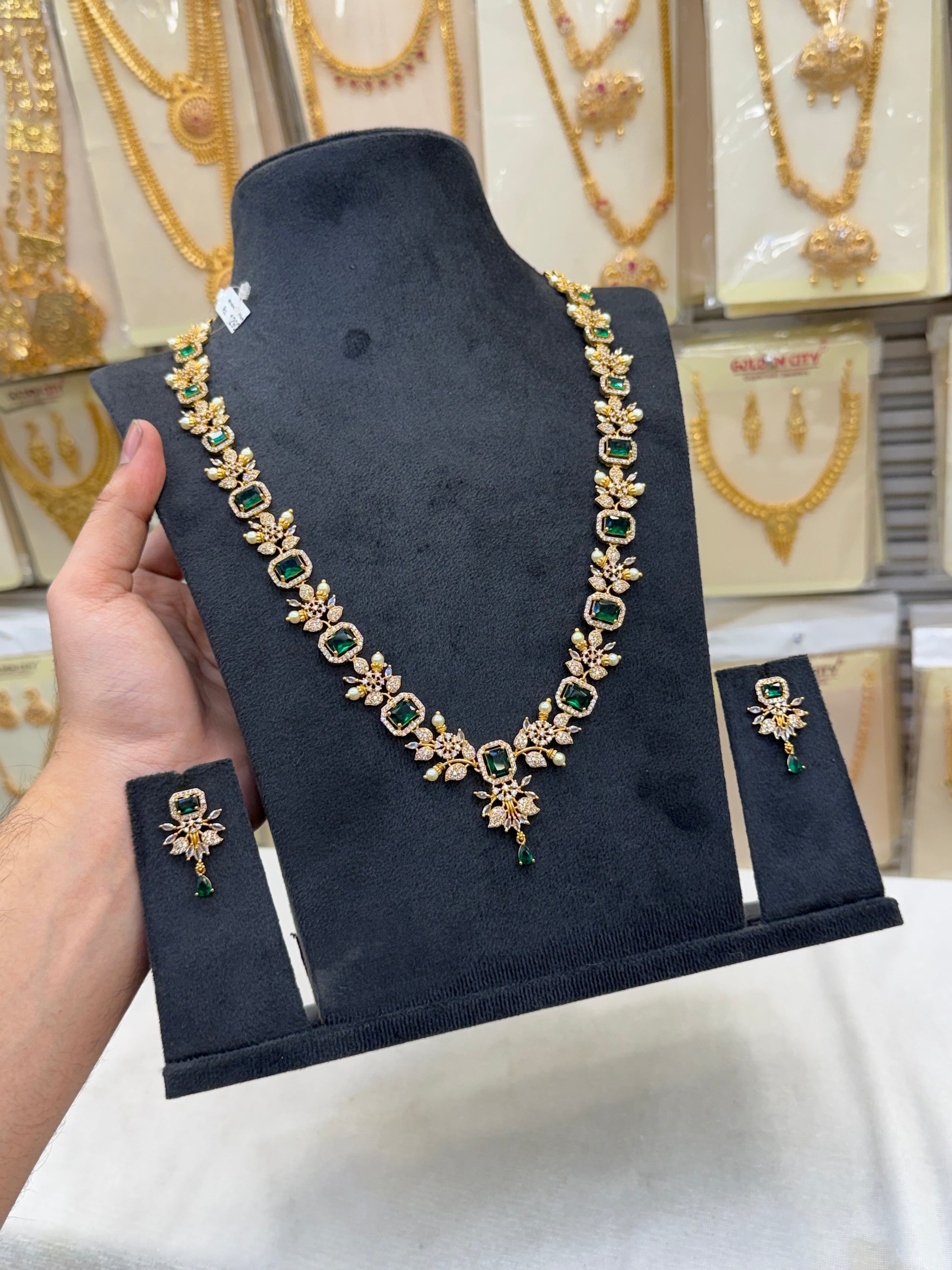 Explore our premium A.D. Haram collection featuring grand long necklace designs with sparkling American Diamonds — perfect for bridal and wedding occasions.