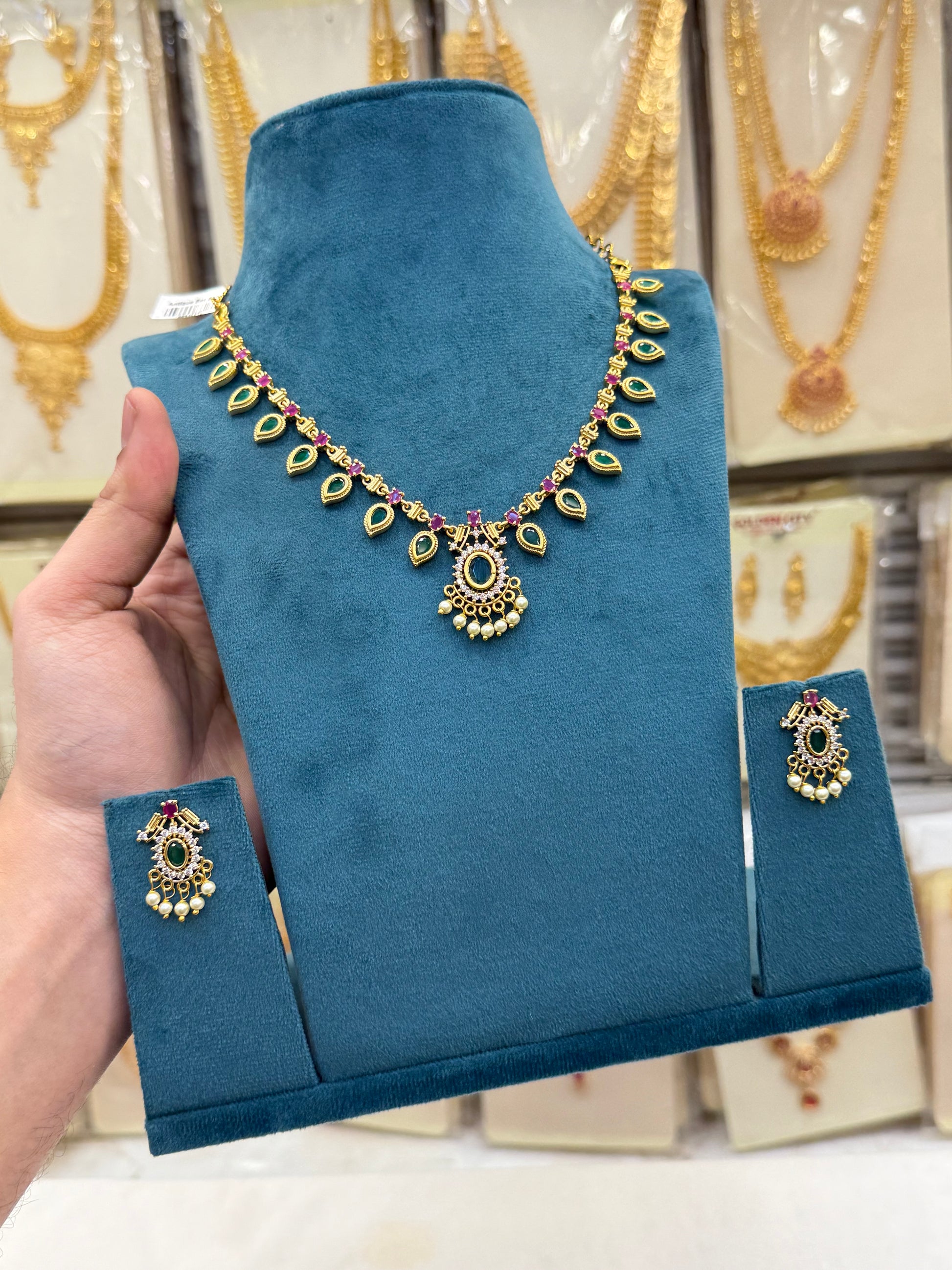 Inspired by traditional Kerala craftsmanship, this necklace features rich green emerald stones that reflect timeless elegance.