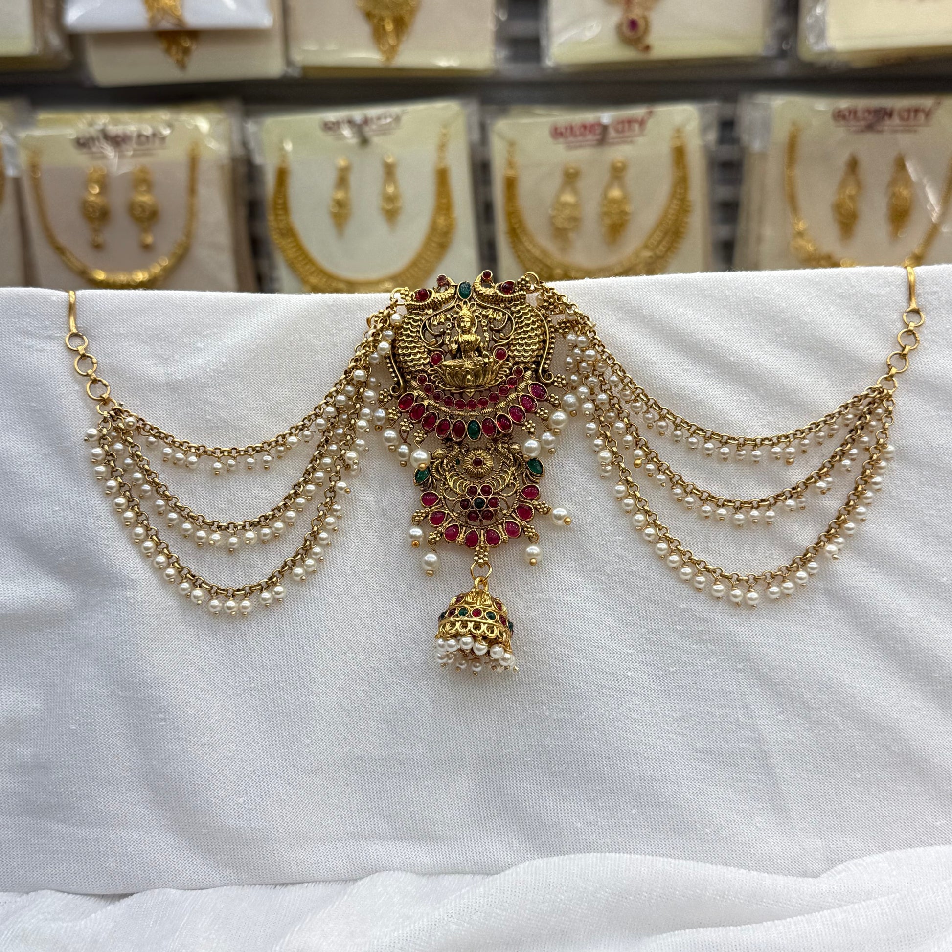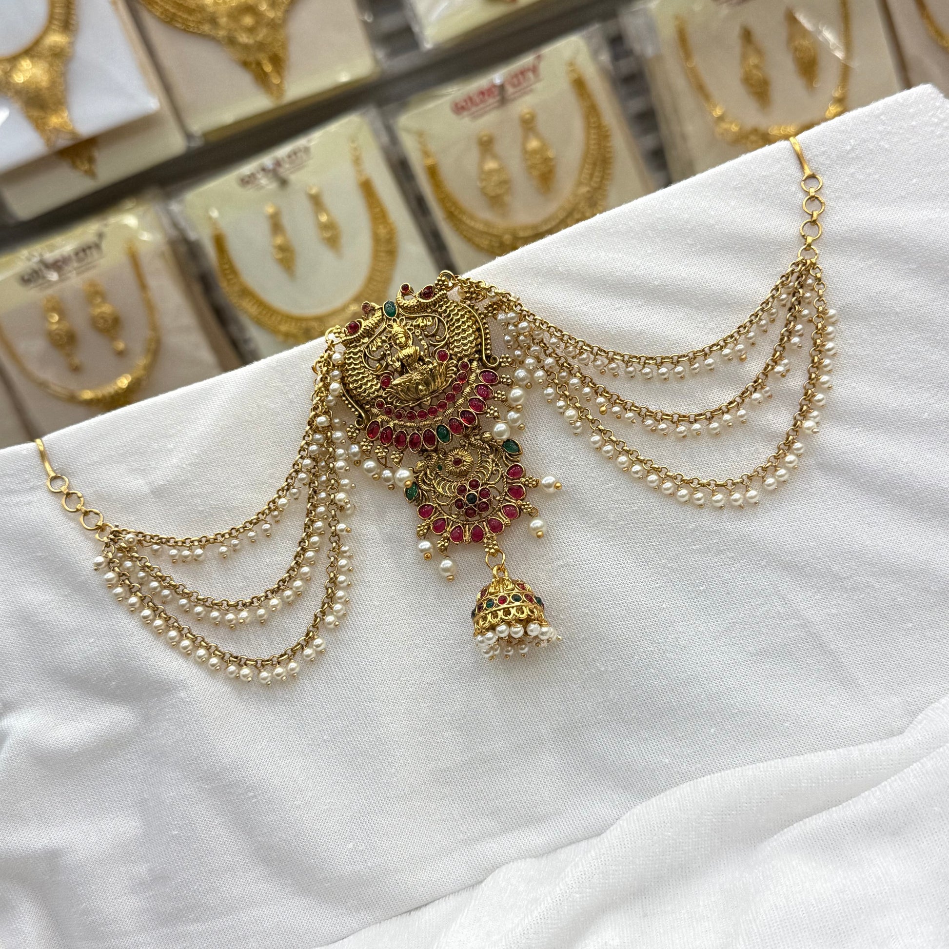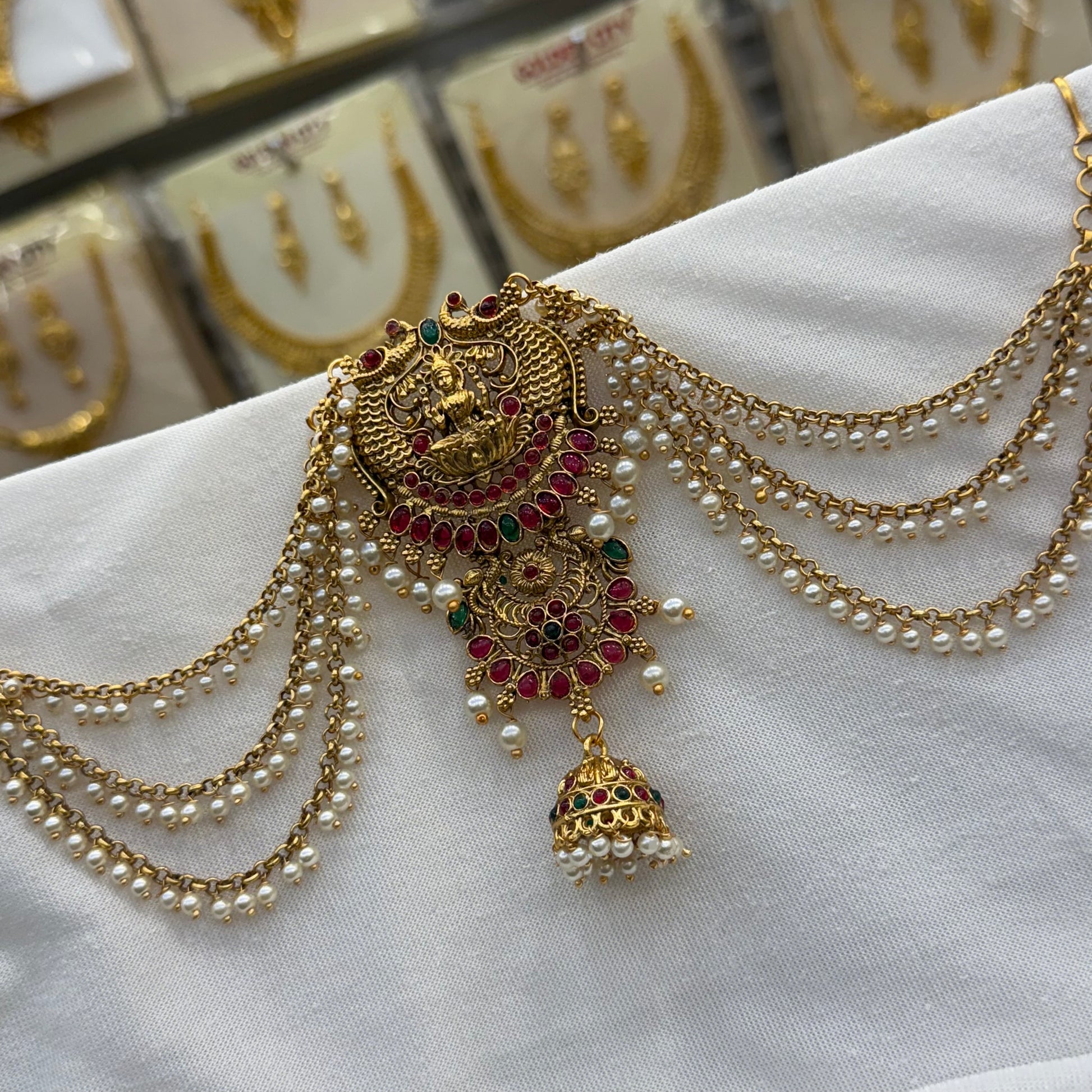 Adorned with divine Lakshmi and elegant peacock motifs, this three-layer blends spiritual symbolism with royal charm — perfect for elevating your bridal or traditional ensemble.