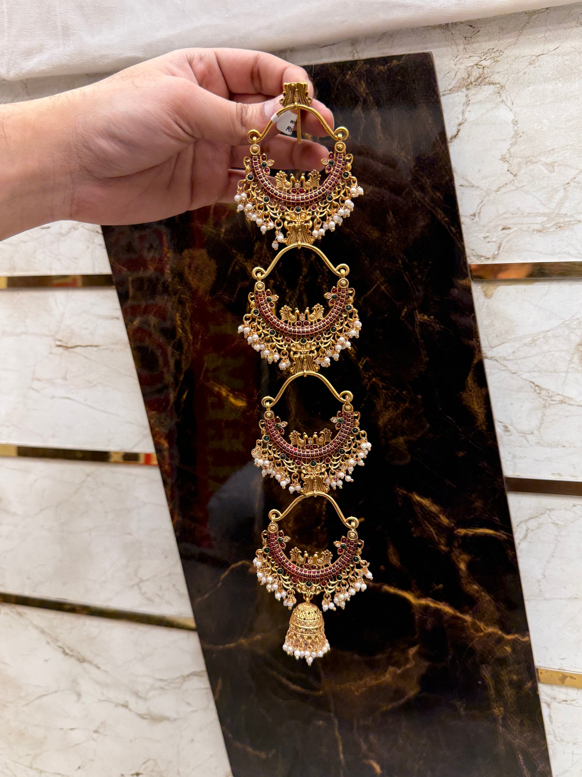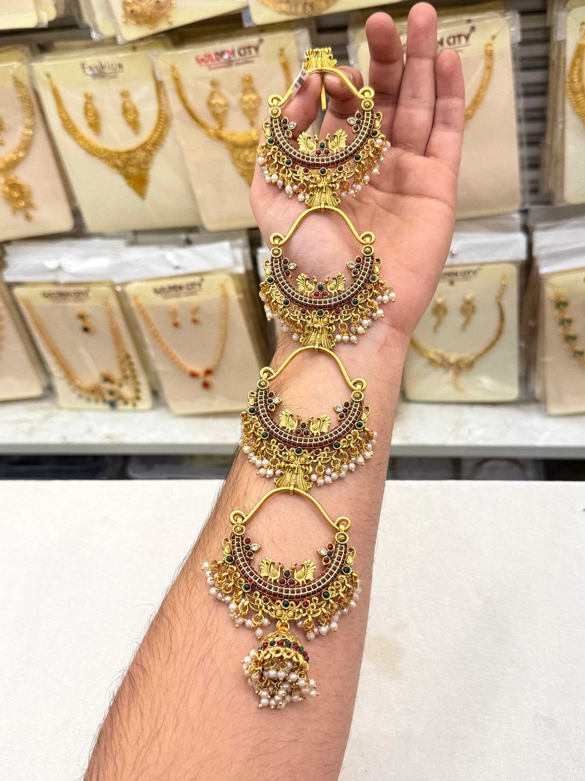 Enhance your bridal look with the Mahalakshmi Bridal Jada. Perfect for brides who want to exude tradition and elegance. Add this accessory to your bridal ensemble for a touch of timeless beauty.