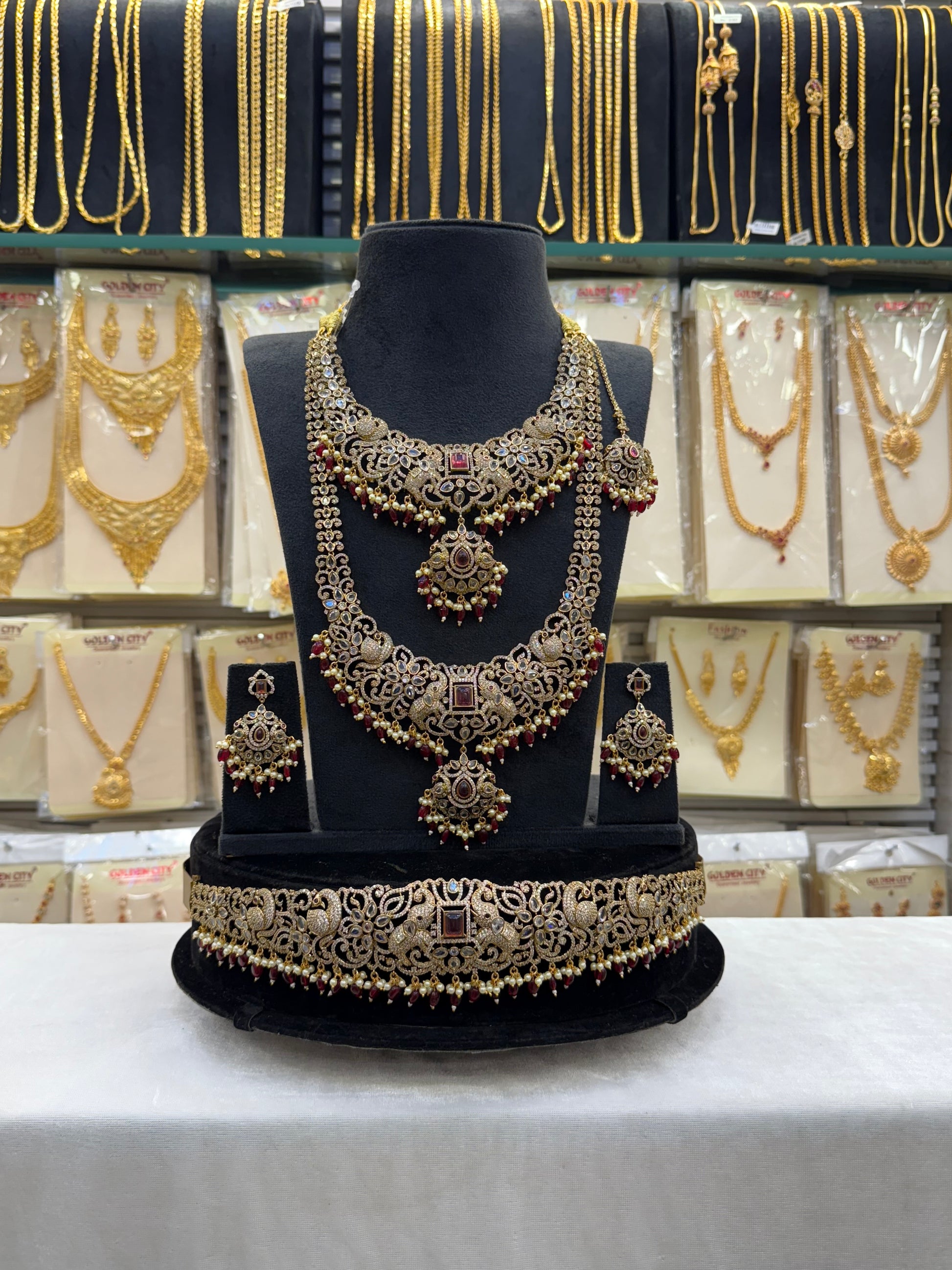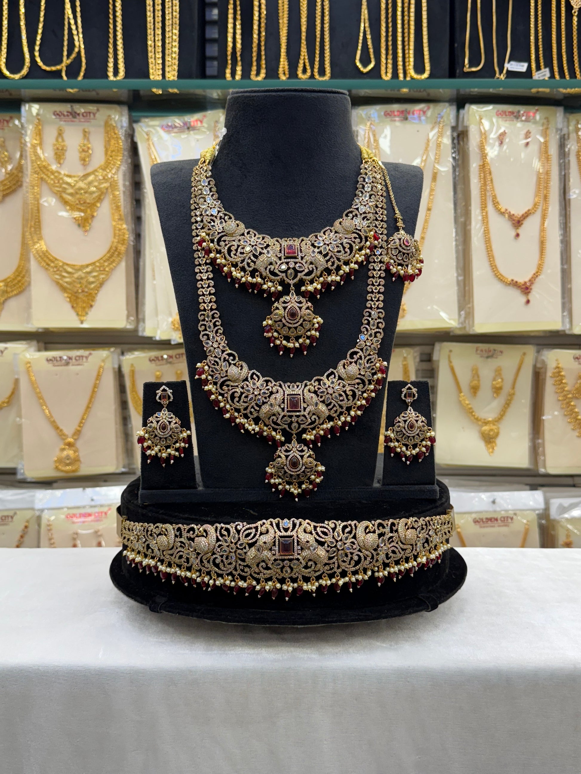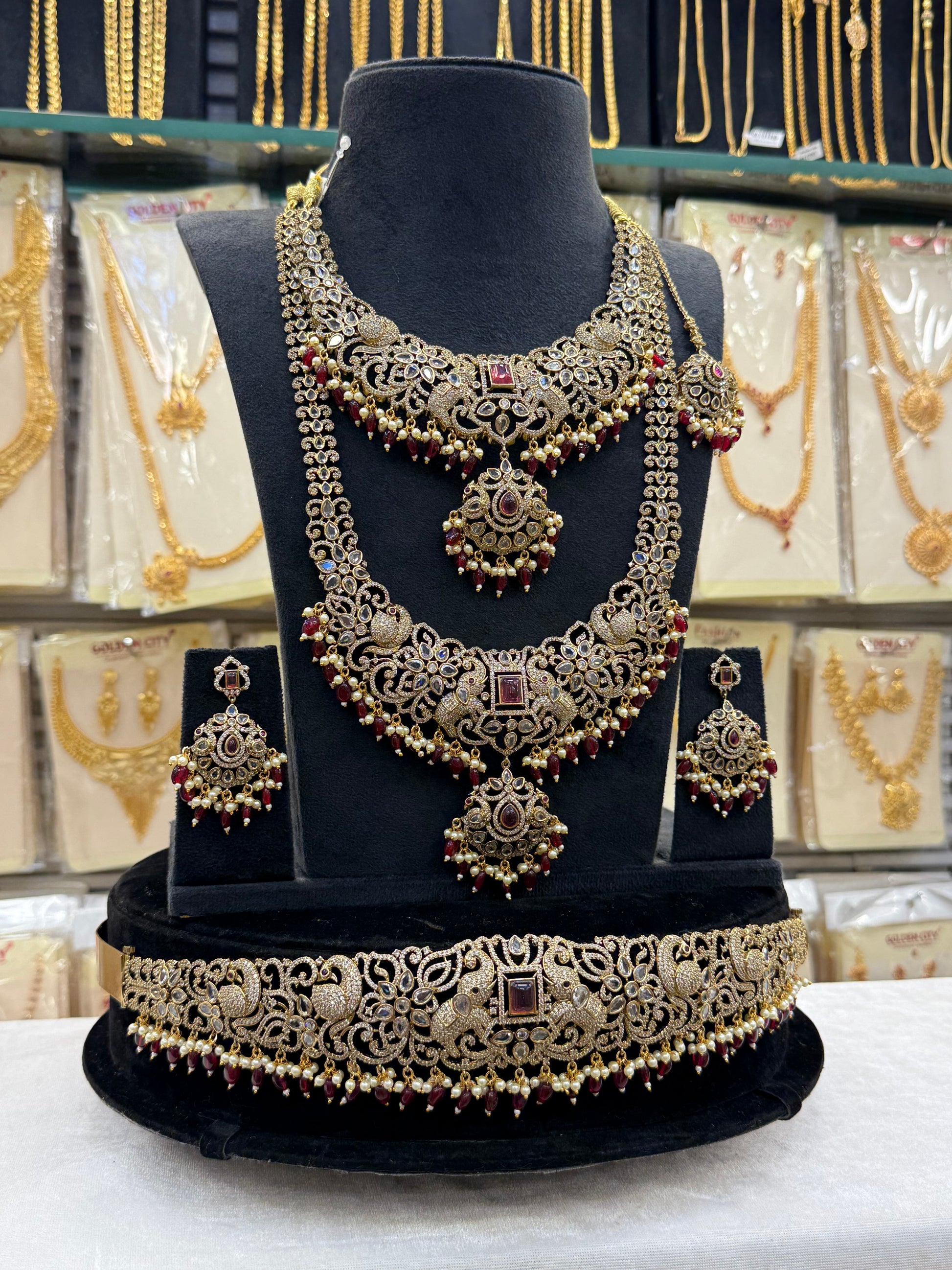 Adorned with rich red maroon beads and intricate Victorian craftsmanship, this bridal set radiates regal charm and classic elegance — perfect for making a bold and timeless statement.
