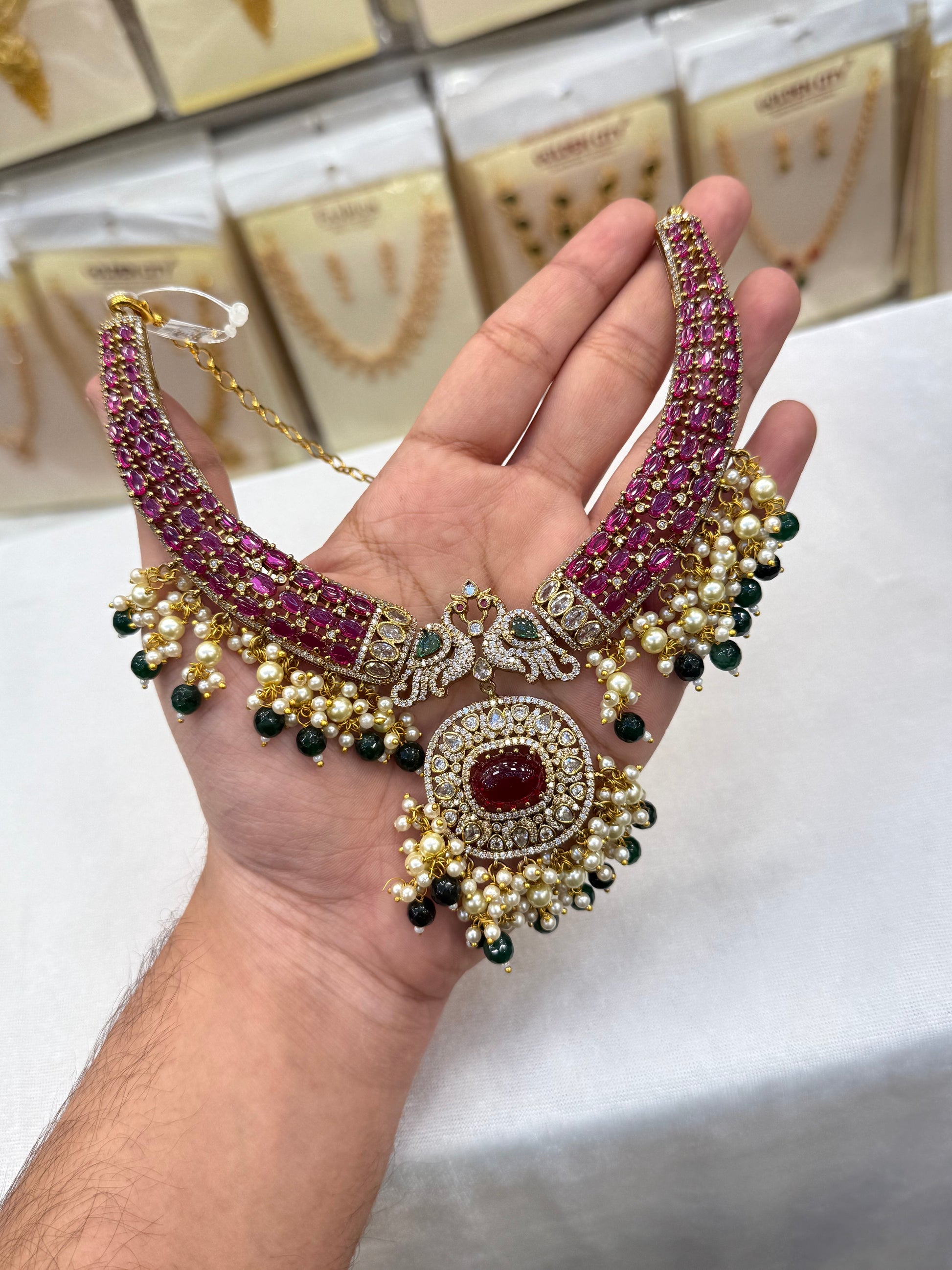Elevate your bridal look with our premium quality Victorian Green Beats Necklace. The trending design will add a touch of elegance to any ensemble. Perfect for weddings or special occasions.
